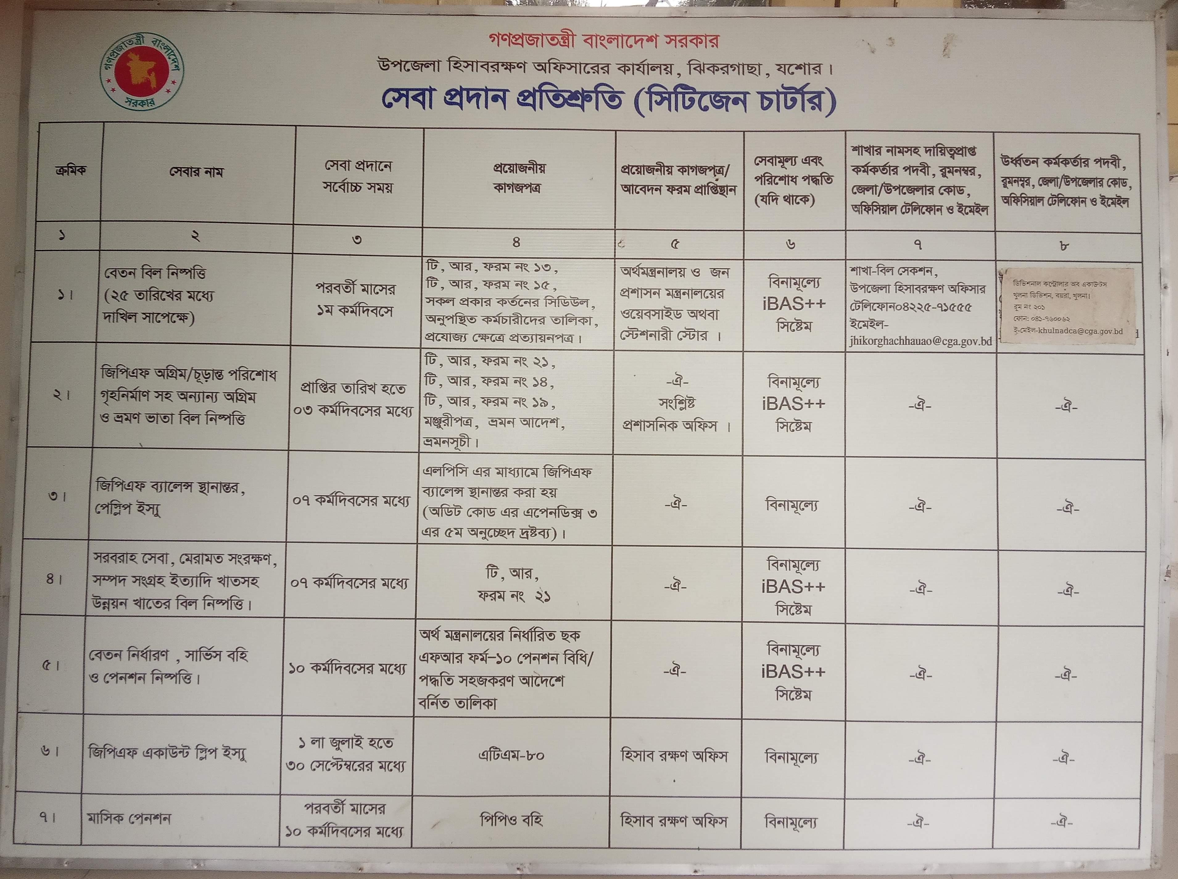 | ১ | হিসাব মহা নিয়ন্ত্রক এর কার্যালয় | বেতন বিল নিষ্পত্তি | উপজেলা একাউন্টস অফিসার, অডিটর, জুনিয়র অডিটর, এমএলএসএস | টোকেন কাউন্টারে জুনিয়র অডিটর বিলে টোকেন নং দিয়ে বিল অডিটরকে বুঝিয়ে দিবে। অডিটর বিলে পে-অর্ডার লিপিবদ্ধ করে সংশ্লিষ্ট রেজিষ্টারে এন্ট্রি করতঃ উপজেলা একাউন্টস অফিসারের নিকট প্রেরণ করবেন। বিল পাশ হওয়ার পর জুনিয়র অডিটর এডভাইস লিখবেন এবং স্বাক্ষরের জন্য উপজেলা একাউন্টস অফিসারের নিকট উপস্থাপন করবেন। পাশকৃত বিল অনুযায়ী এডভাইস স্বাক্ষর হওয়ার পর বিল ও এডভাইসে এম এল এস এস/ জুনিয়র অডিটর এমবুশ প্রদান করবেন। অতঃপর এডভাইস রেজিষ্টারে এডভাইস এন্ট্রি দিয়ে এম এল এস এস সোনালী ব্যাংক ট্রেজারী শাখায় পৌছাবেন। | ২৫ তারিখের মধ্যে দাখিল সাপেক্ষে পরবর্তী মাসের ১ম কর্মদিবসের মধ্যে | নাই |